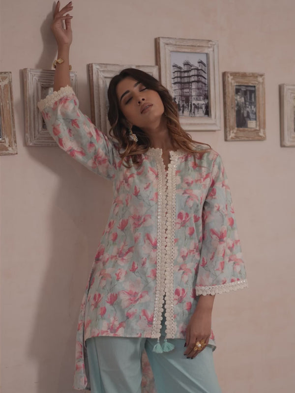Unique cut with high-low hem top for chic & modern flair. Light pastel floral bloom against ivory base, adding feminine & romantic touch. Scalloped lace trims on neckline, sleeves & pant hem enhancing the delicate feel.